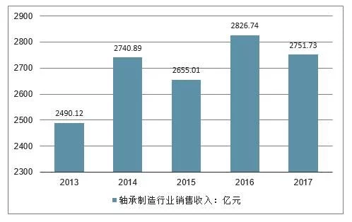 2013-2017年中国轴承制造行业销售收入也呈波动变化趋势。2016年行业销售收入为2826.74亿元,同比增长6.47%;2017年,行业实现销售收入2751.73亿元,同比下降2.6%。总体来看,近三年我国轴承行业发展速度较之前有所放缓。