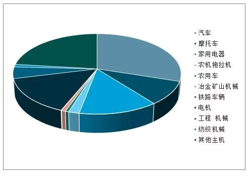 轴承的应用十分广泛,目前全球轴承主要运用于汽车行业,全年汽车轴承销量为10.02亿套,占轴承总销量的29.95%。未来,随着世界汽车制造业向中国转移,比例将进一步提升。除汽车行业外,轴承行业还广泛运用于电机、家电、摩托车、农机、工程机械、重型机械、电力、铁路、机床等行业,其中电机行业需求量占行业的14.92%;家电行业占13.55%;另外,摩托车、工程机械和农机所占比重也较大,分别为9.51%、4.63%和1.82%。