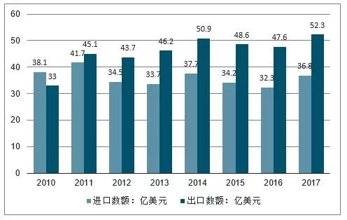 2006年至2017年我国轴承出口额增速高于进口,进出口贸易顺差达15.50亿美元。