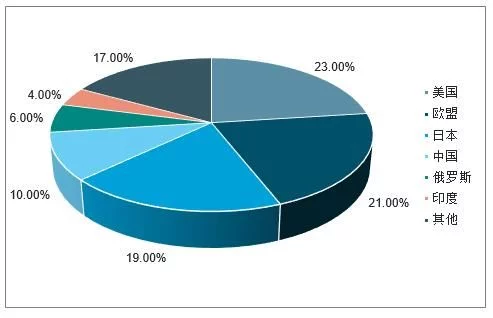 从具体国别看,美国市场Z大,占全球的23%;欧盟国家次之,占21%;日本占19%;俄罗斯占6%;印度占4%;中国占10%。