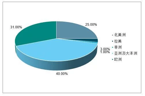 若按地区分,全球轴承市场可划分为亚洲及大洋洲市场、欧洲市场、北美洲市场、拉美市场、非洲市场五大块,分别占有40%、31%、25%、3%和1%的份额。